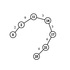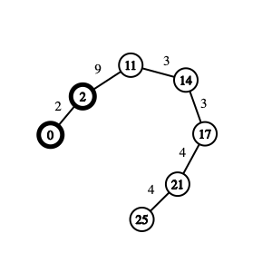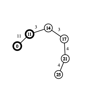 출발지점과 도착지점이 25만큼 떨어져 있고, 바위가 [2, 14, 11, 21, 17] 지점에 놓여있다.