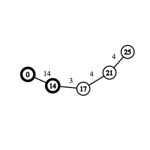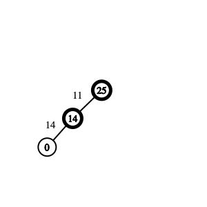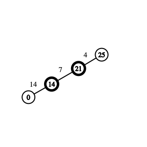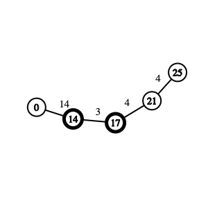 6. 바위14와 바위25의 거리는 11이다. 12미만 이므로 바위25를 제거해야하지만, 끝점이므로 바위14를 제거한다. (5)